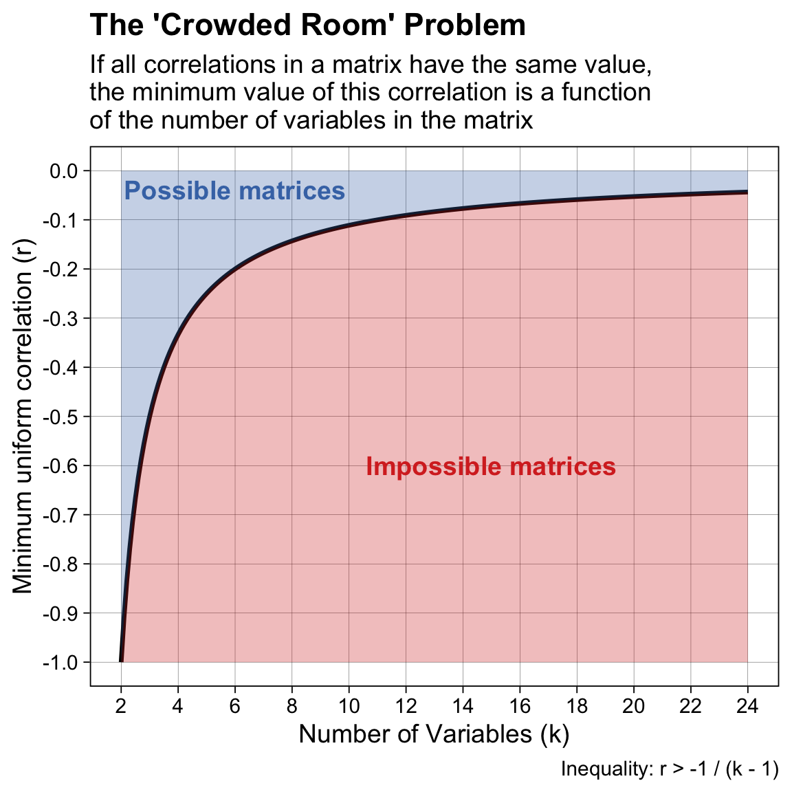 Not all combinations of correlations are possible in a correlation matrix. This is sometimes described as the 'crowded room' problem. By analogy, the more people are packed into a room, the closer they have to stand to one another, and there is less and less freedom for how each individual occupies the space. Similarly, the more correlations are in a matrix, the less freedom they, with each value required to be within narrower and narrower bounds.
