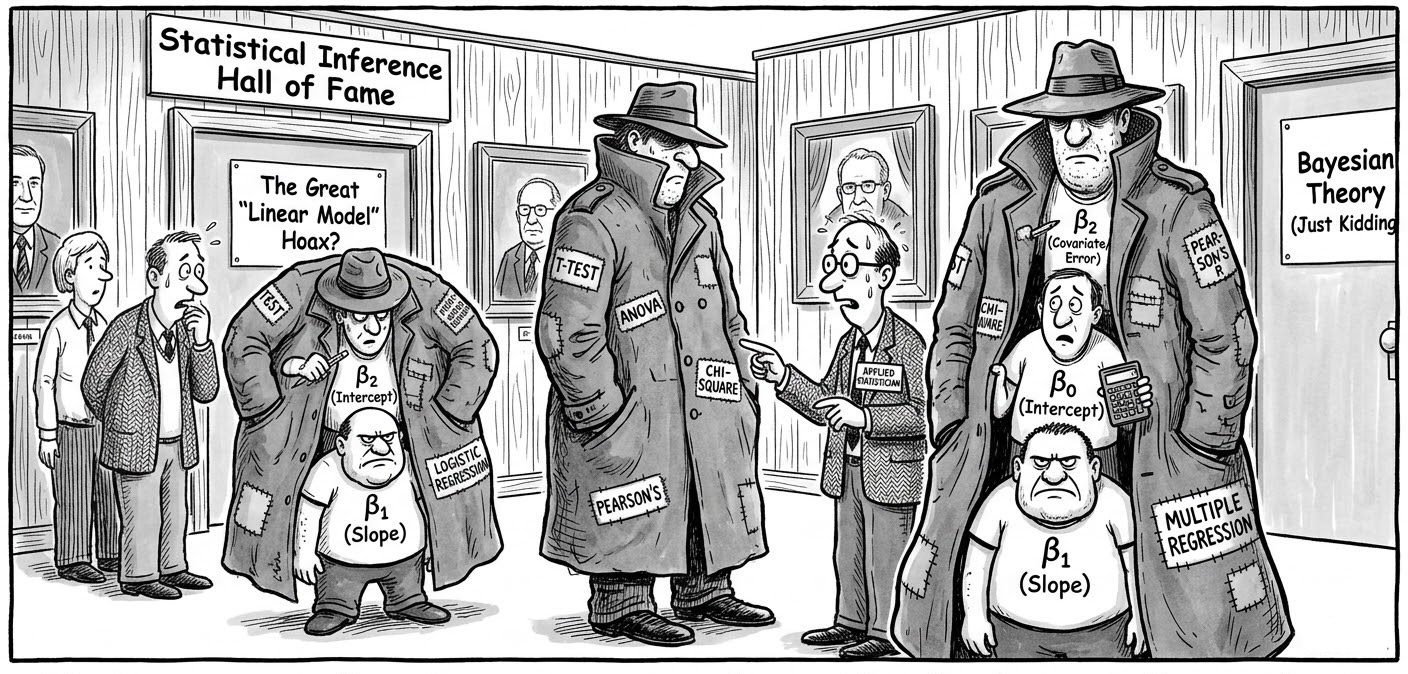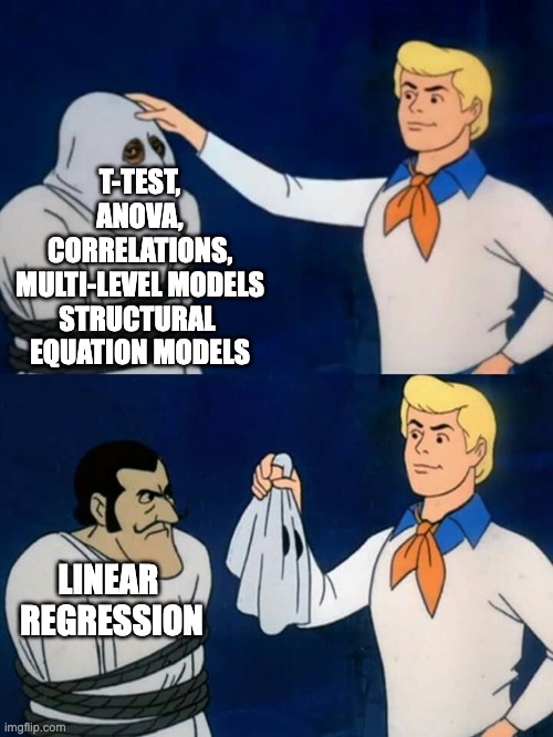 Ok not everything. But a large proportion of the most commonly used statistical methods are just a linear regression model hiding in a trench coat.