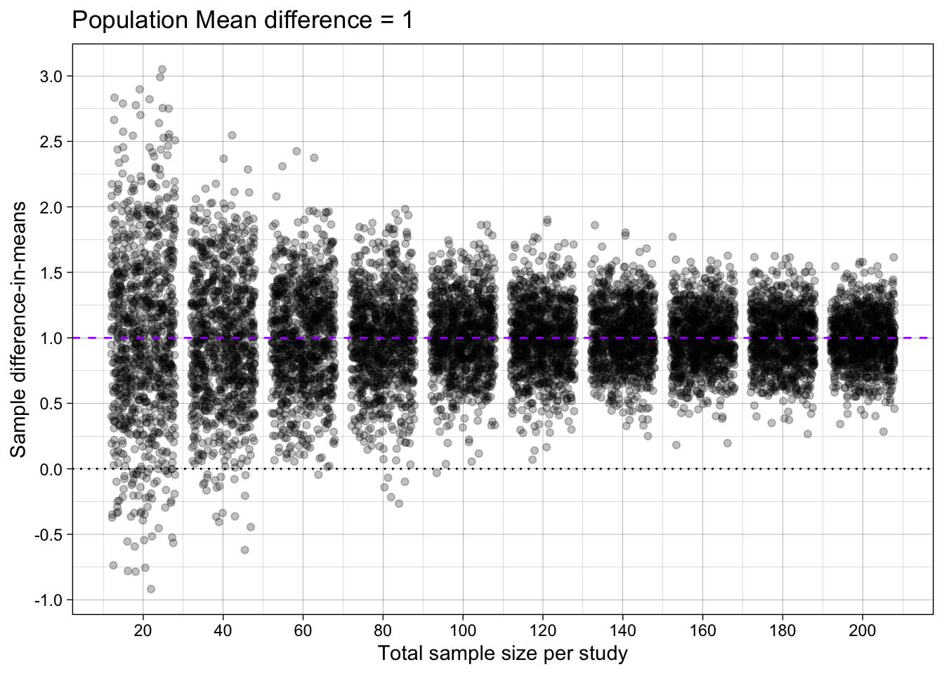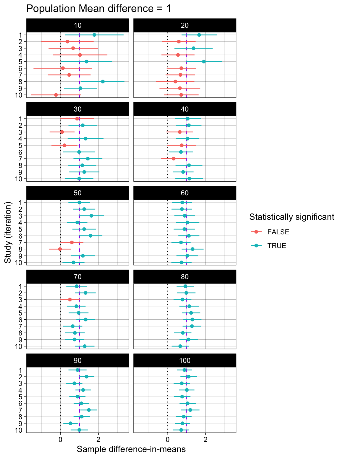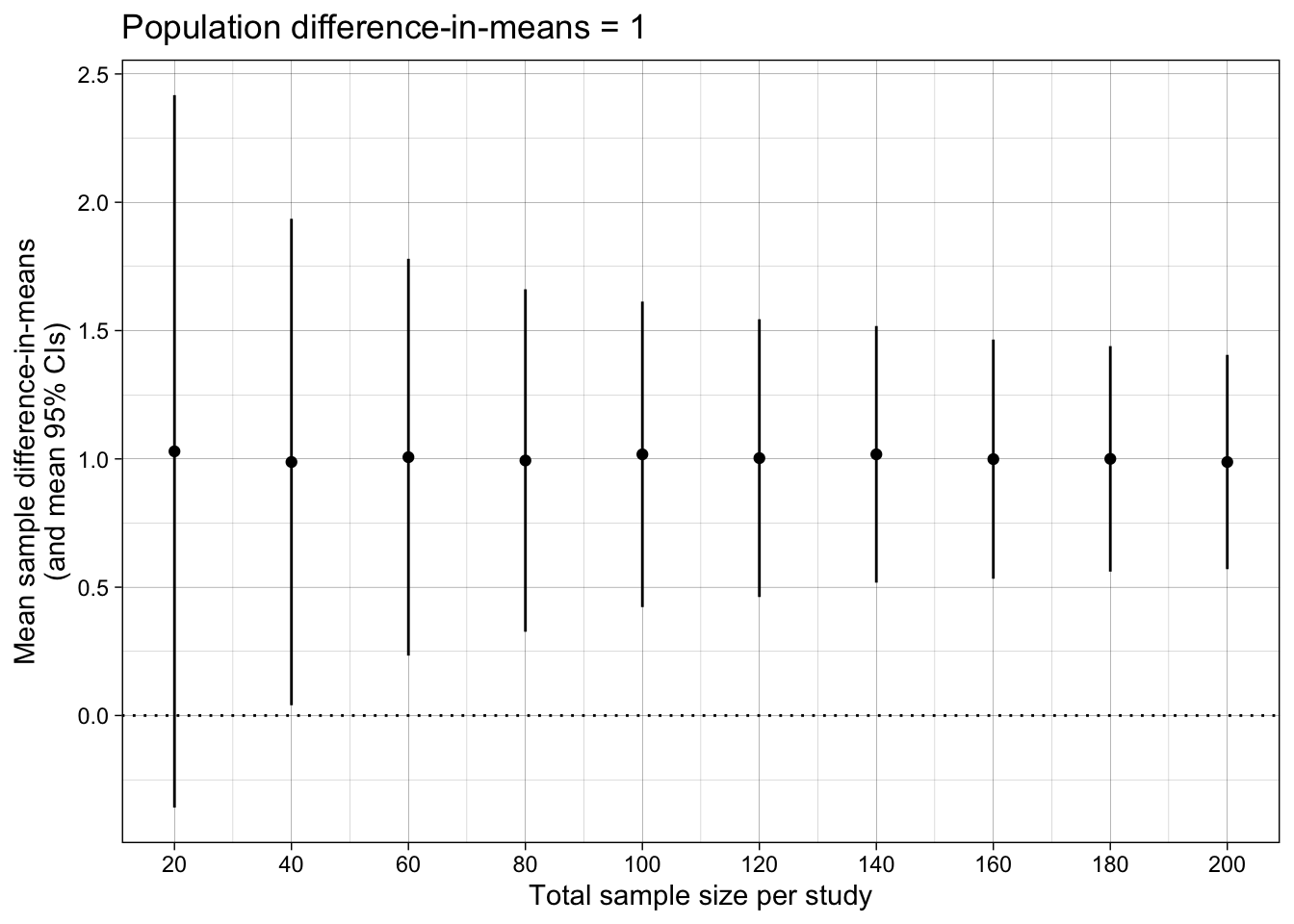 name = "Mean sample difference-in-means\n(and mean 95% CIs)") +