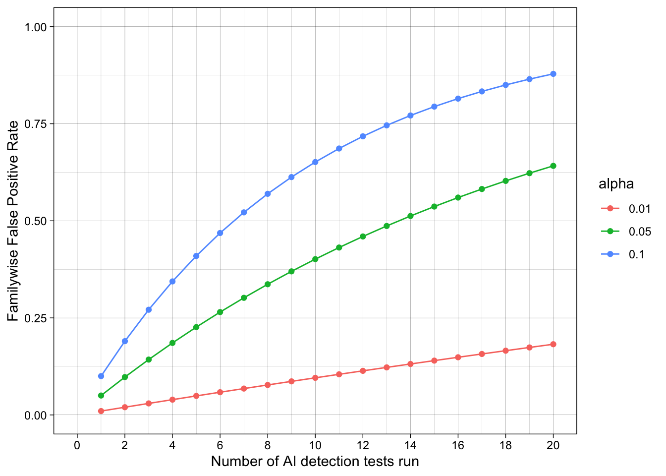 Despite the test being advertised as having high accuracy, in the sense of a low false-positive rate, there is a strong risk of false positives when many tests are run. Students submit many different assignments over their studies. Assuming no AI policy violations occur, 20 assignments are tested, the tests are independent, and an alpha value of 5% is used, there is a strong risk (> 50%) that individual students will still have at least one of their assignments flagged as an AI policy violation across their studies.