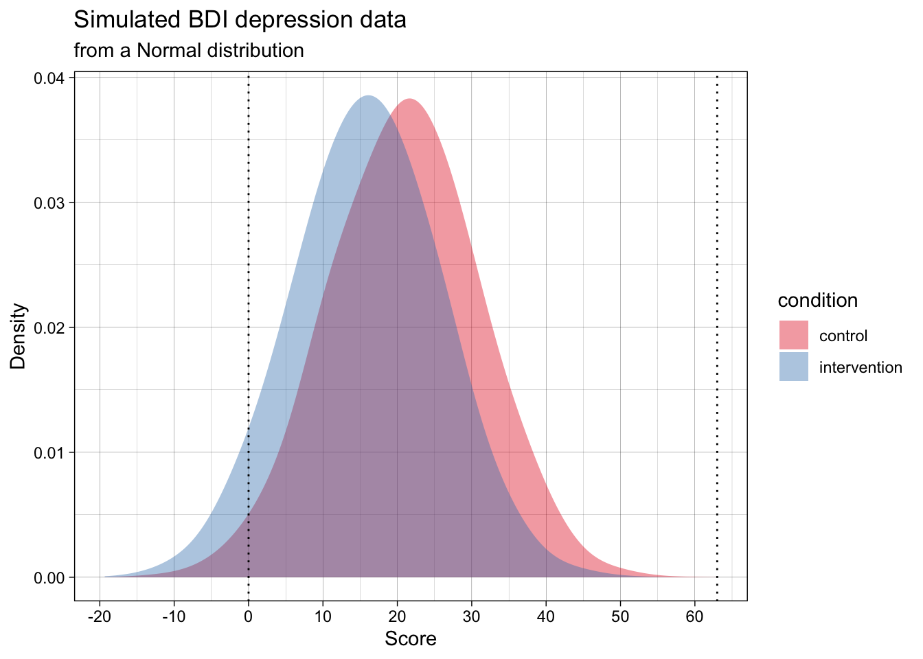 A simple example that is useful to many simulations of psychological data - and the example that we’re going to use frequently in the next several chapters - is the simulation of two groups drawn from normal distributions with known means and standard deviations. In the previous example, these referred to heights for men and women, but in many of the following examples they will instead represent the intervention vs. control group of a randomised controlled trial (e.g., psychotherapy for depression).