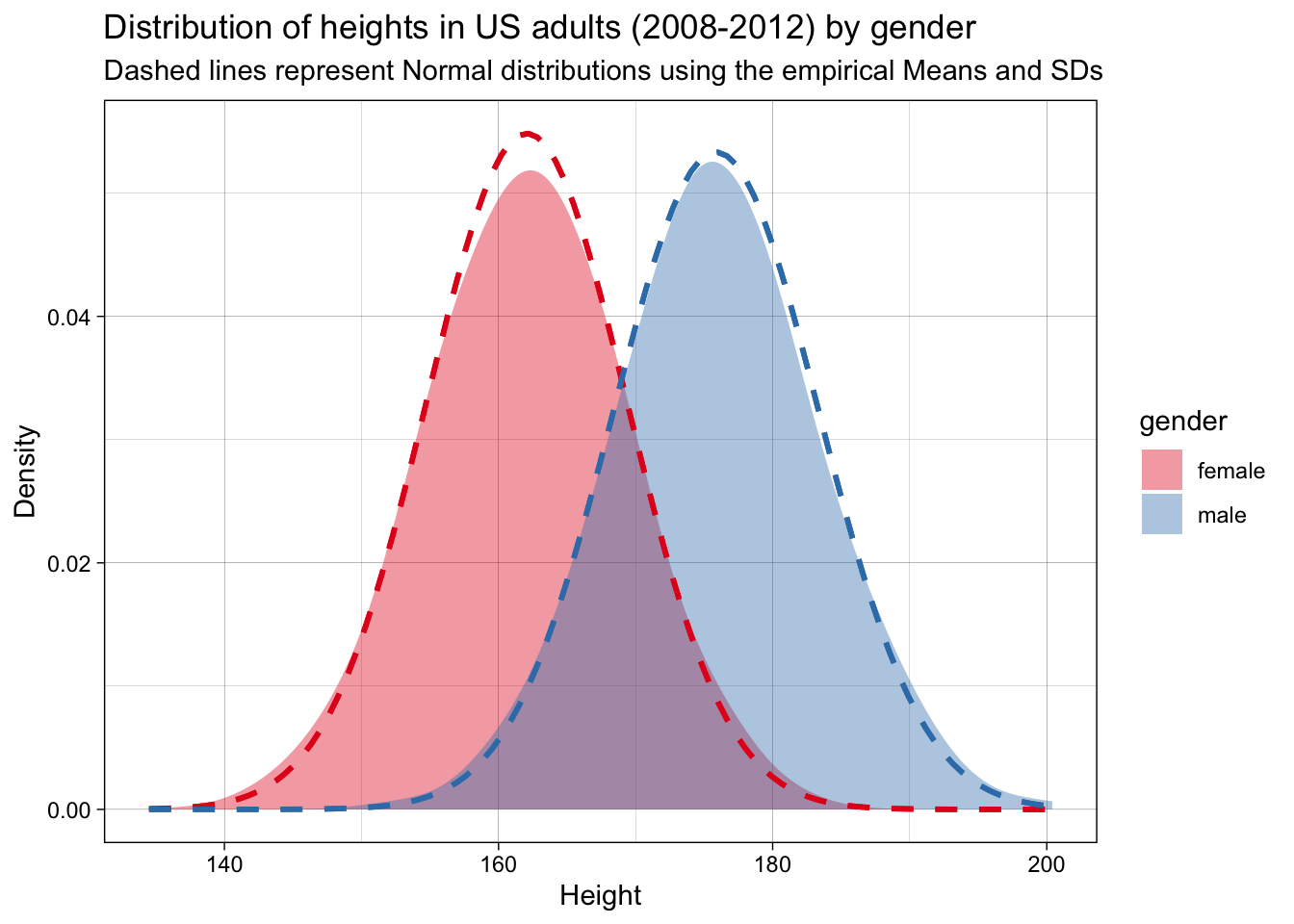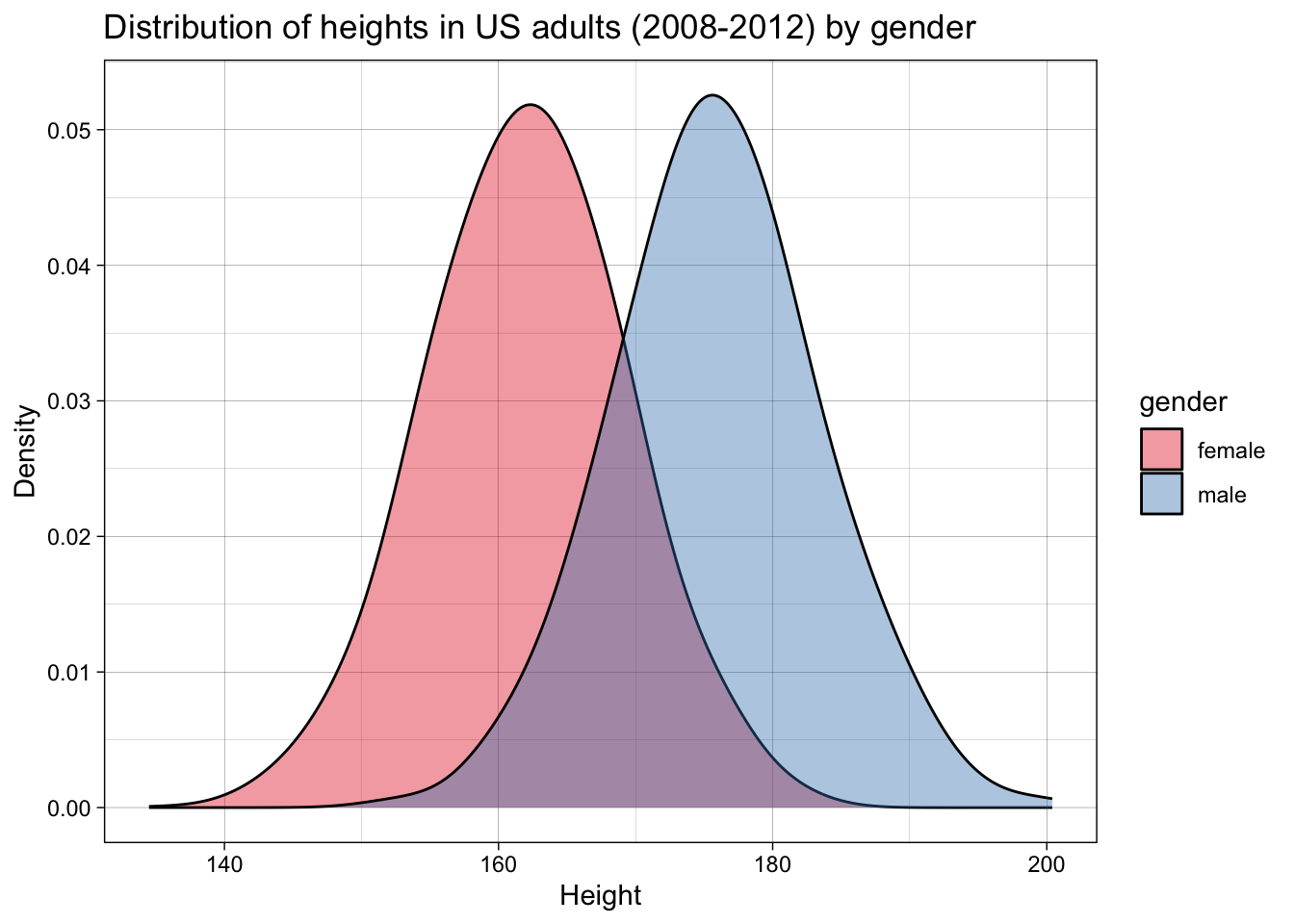 For example, let’s imagine we want to simulate a dataset of the heights of adult women versus men. We can take data from the US Center for Disease Control’s NHANES dataset, in this case for the years 2008-2012, which contains data for about 7000 representative US adults.