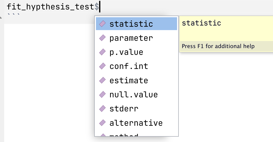If you have already fit a model and assigned its results to an object, like `fit_hypthesis_test` above, you can then access previews of its elements using `$`: