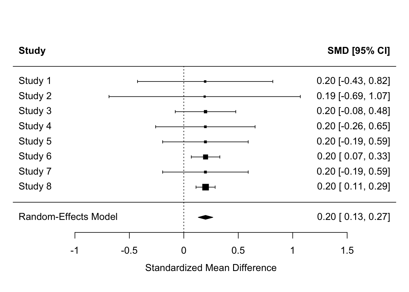 The above linear regression produces comparable results as when you fit a ‘proper’ fixed-effects meta-analysis using the {metafor} package. There are some small differences in the effect size and its 95% CIs that aren’t important to understand here. The ‘Overall’ row reports the meta-analysis results.