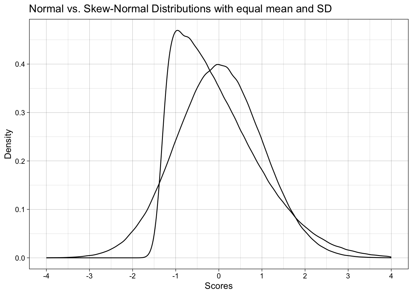 title = "Normal vs. Skew-Normal Distributions with equal mean and SD") +
